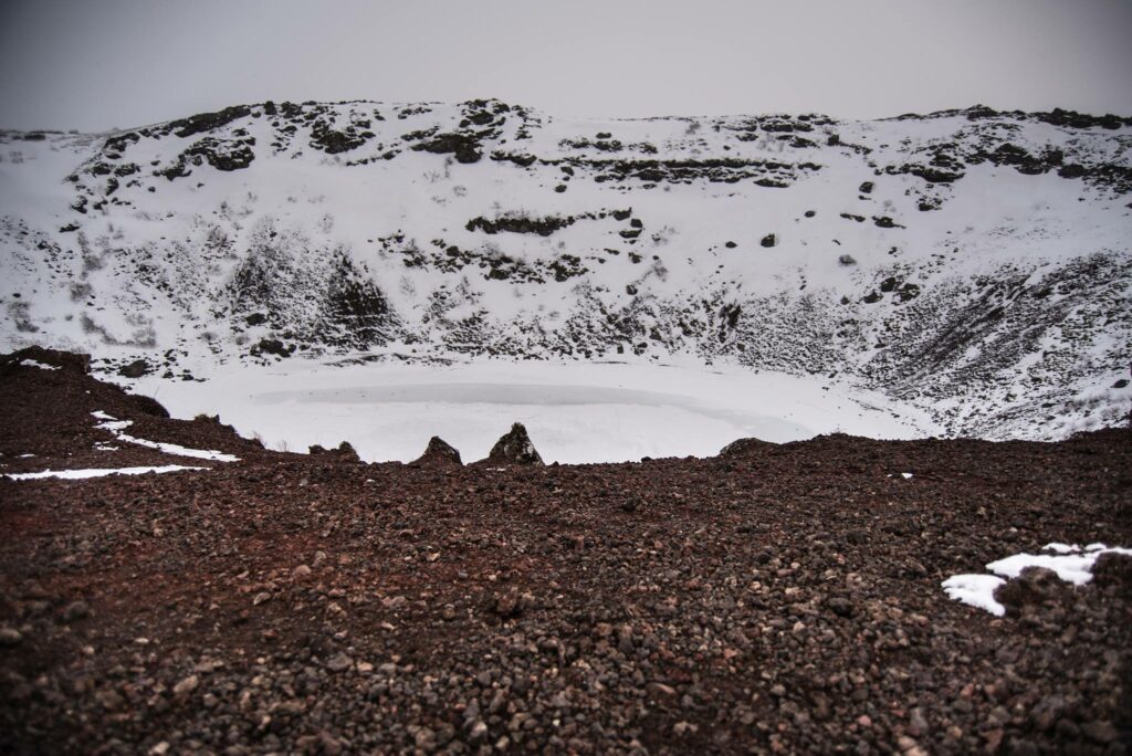 Première étape : Kerið, un cratère volcanique de 55 mètres de profondeur. Il a plus de 5 500 ans et est devenu un lac. D’après les photos du dépliant, ça a l’air bien plus beau en été, mais sa taille reste impressionnante ! En saison chaude, l’eau est d’une profonde couleur aigue-marine. Mais il est strictement interdit de s’y baigner.