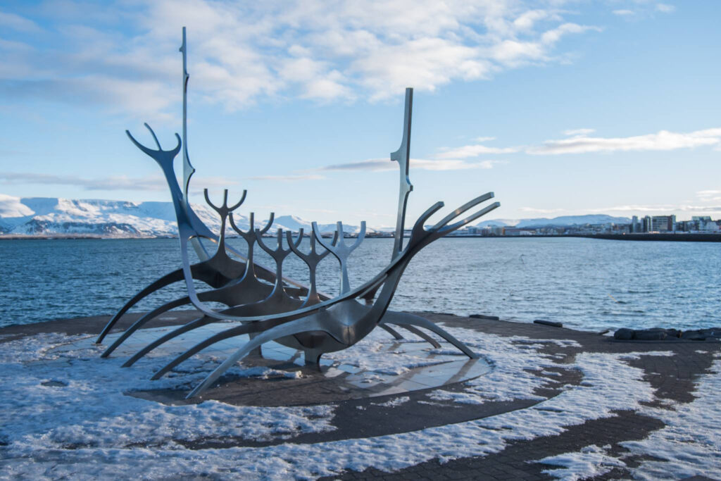 La longue route près de l’océan est parsemée de sculptures de différents styles. Entre autres Sólfar : Le voyageur solaire, ci-dessus.